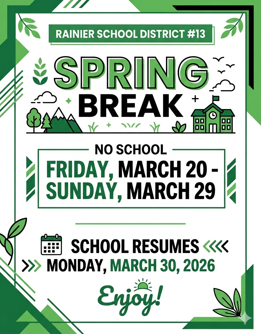 Spring Break, 3/20-29, 2026 Rainier School District #13Spring BreakNo School: Friday, March 20-Sunday, March 29School resumes Monday, March 30, 2026Enjoy!